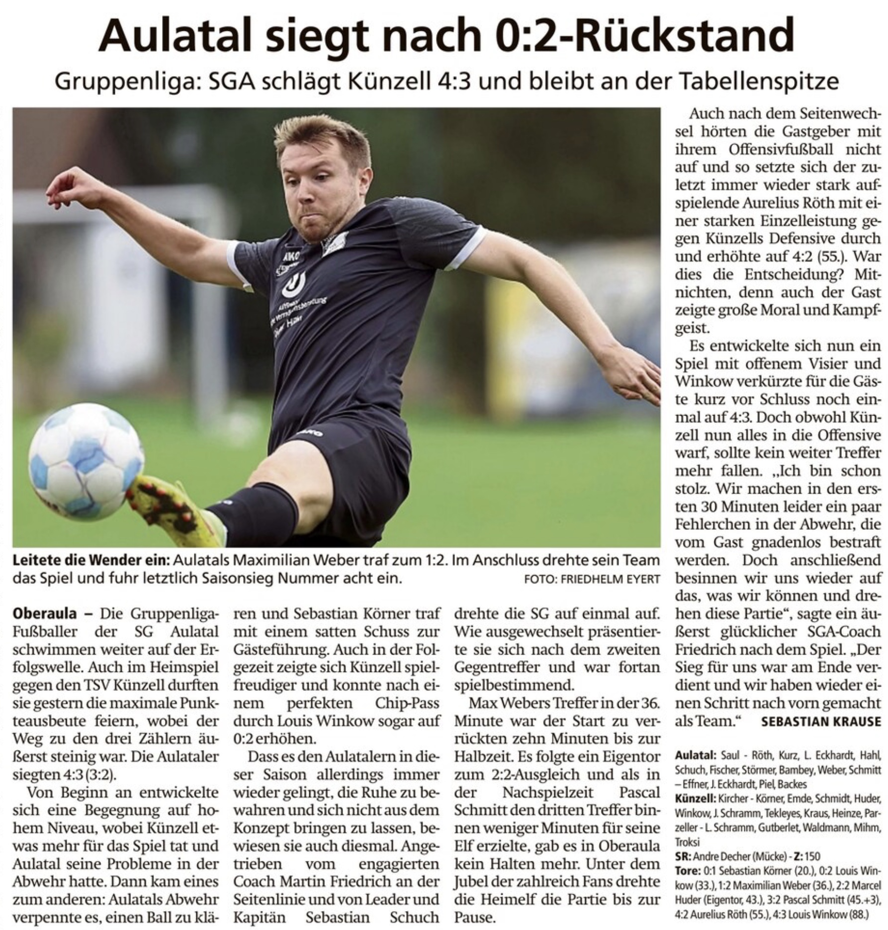 In der gutklassigen Partie musste Aulatal jedoch nach Gegentreffern von Sebastian Körner (20.) und Louis Winkow (33.) einem 0:2-Rückstand hinterherlaufen. Das Team von Coach Martin Friedrich blieb einmal mehr ruhig und belohnte sich durch Maximilian Weber (36.), ein Eigentor durch Marcel Huder (43.) und Pascal Schmitt (45.+3) im Stile einer Spitzenmannschaft noch vor der Pause mit der Wende und dem Führungstreffer.