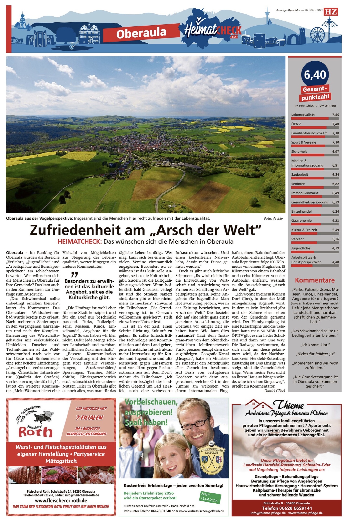 „Das Schwimmbad sollte unbedingt erhalten bleiben“, lautet ein Kommentar. Das Oberaulaer Waldschwimmbad wurde bereits 1929 erbaut. Nach mehreren Sanierungen in den vergangenen Jahrzehnten und nach der Komplett-Erneuerung des Wirtschaftsgebäudes mit Verkaufskiosk, Umkleiden, Duschen und Technikräumen ist das Waldschwimmbad nach wie vor für Gäste und Einheimische eine sehr beliebte Einrichtung. „Arztangebot verbesserungsfähig. Öffentliche Infrastruktur (Qualität der Straßen) verbesserungsbedürftig!“, lautet ein weiterer Kommentar. „Mein Wohnort bietet eine Vielzahl von Möglichkeiten zur Steigerung der Lebensqualität“, wertet hingegen ein anderer Kommentator.