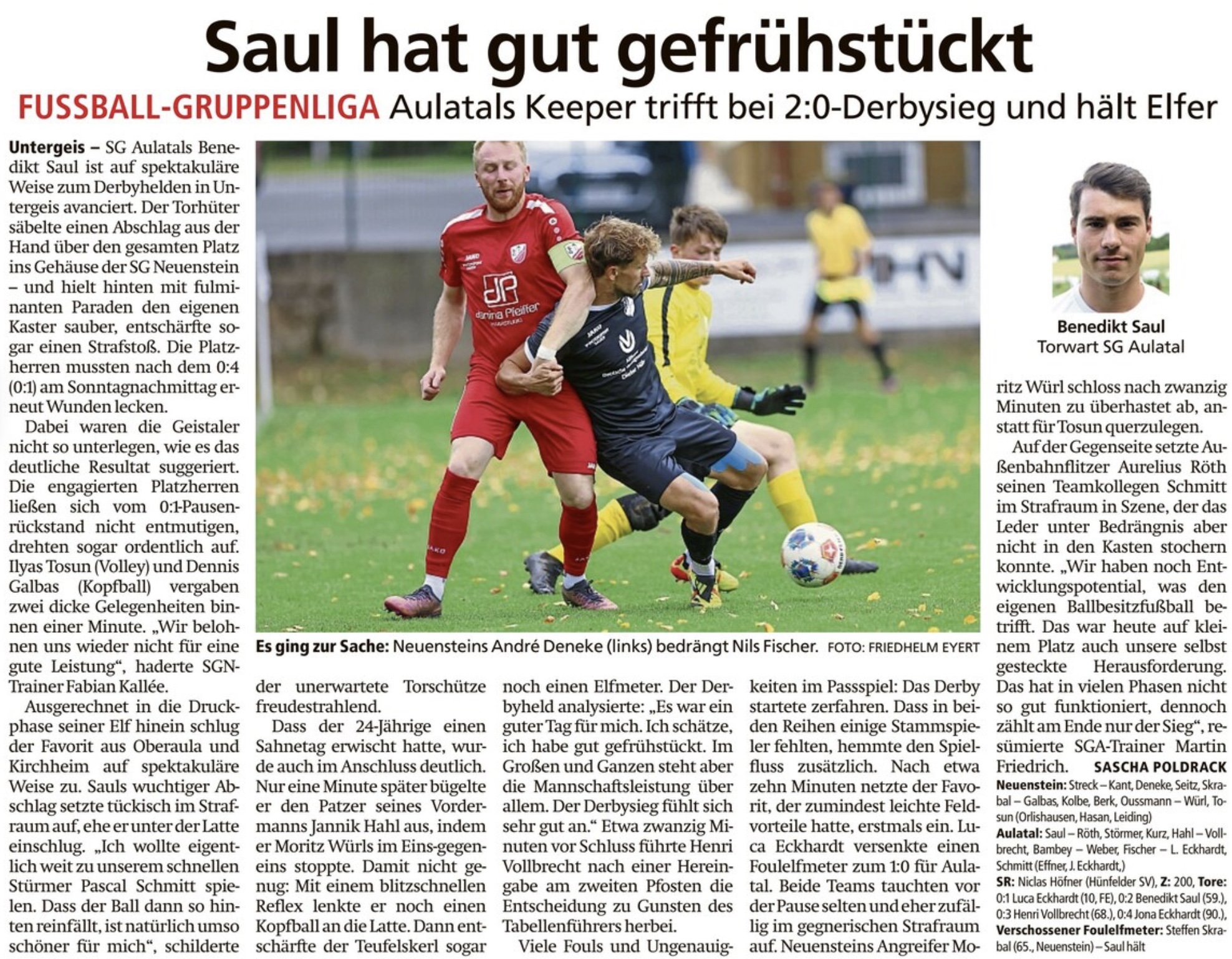 Die Ausgangslage: Der 4:0-Sieg in Untergeis war sehenswert. Mit Torhüter Benedikt Saul als „Spieler des Tages“, der nicht nur ein Tor per Abschlag schoss, sondern obendrein noch einen Elfer hielt und auch weitere Chancen der Neuensteiner zunichte machte. „Er war ja schon vorher ein starker Keeper, aber momentan ist er in der Form seines Lebens“, lobt ihn Trainer Martin Friedrich. Trotz des starken Auftritts sah der Aulataler Coach aber auch Luft nach oben.