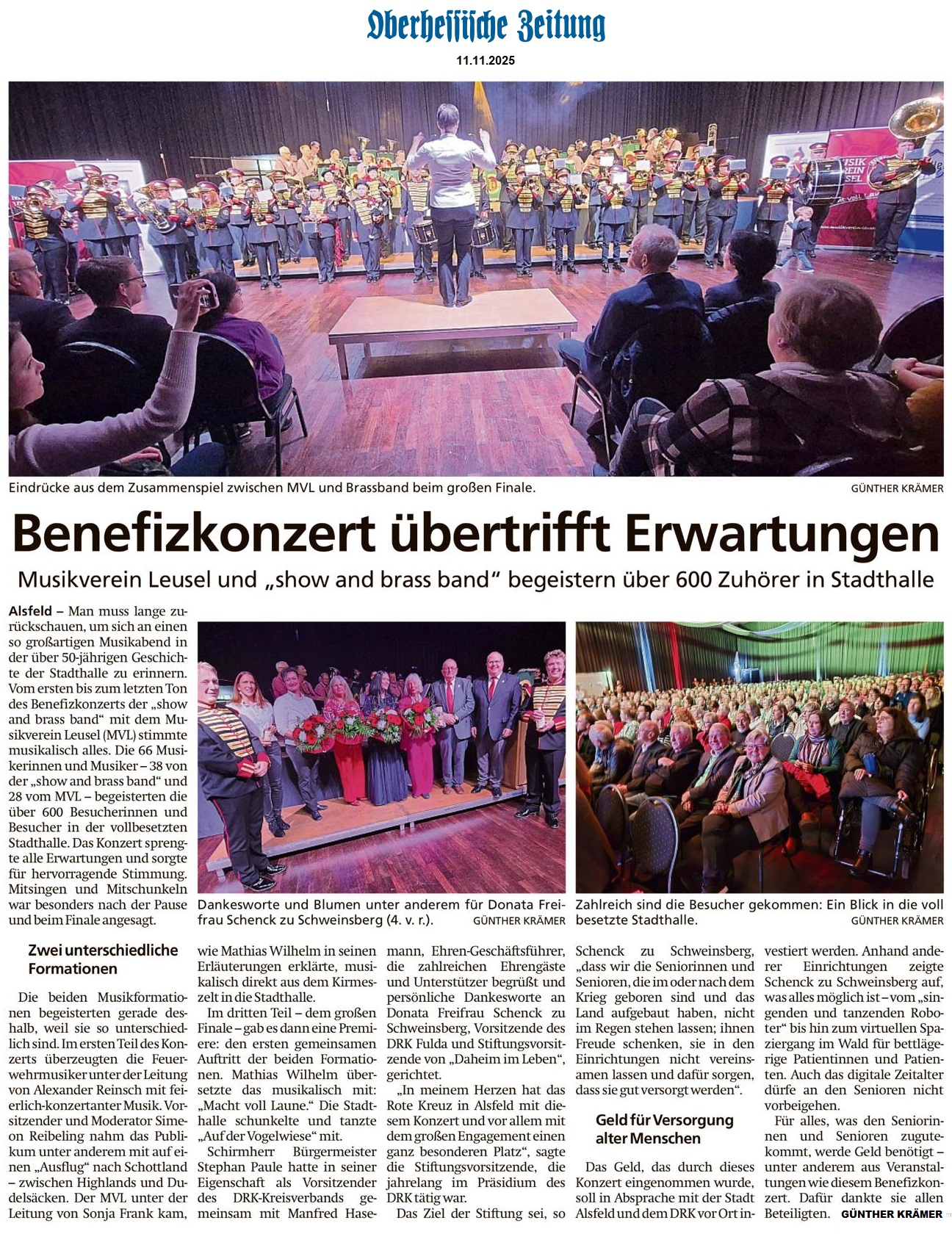 Musik, die verbindet, und Herz, das hilft: Unter diesem Motto luden die Senioren-Stiftung „daHeim im Leben“, der DRK-Kreisverband Alsfeld sowie die Stadt Alsfeld am Samstagabend zu einem außergewöhnlichen Konzert in die Stadthalle nach Alsfeld (Vogelsbergkreis) ein. Zum ersten Mal überhaupt standen der Musikverein Leusel und die „Show and Brass-Band“ der Freiwilligen Feuerwehr Alsfeld gemeinsam auf einer Bühne – ein Ereignis, das nicht nur musikalisch, sondern auch gesellschaftlich von besonderer Bedeutung war. Unterstützt wurde die Abendveranstaltung vom DRK Fulda.