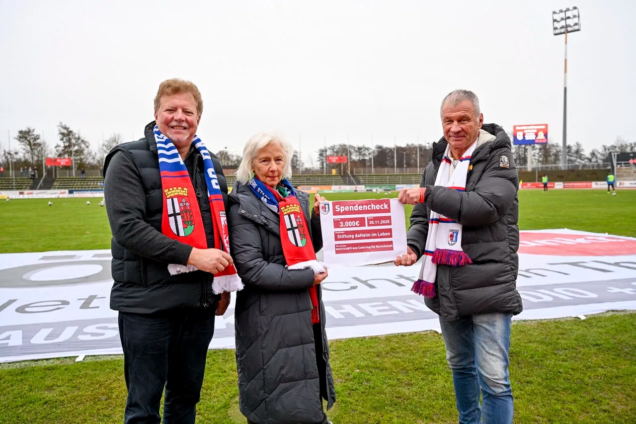 Starkes Zeichen: Mitten im Stadion der Stadt, wenige Minuten vor dem Anpfiff des Regionalligaspiels zwischen der SG Barockstadt Fulda-Lehnerz und Eintracht Trier, stand nicht der Fußball im Mittelpunkt – sondern Solidarität. Die SGB überreichte gemeinsam mit Helfrich&Franz Catering einen Spendenscheck über 3.000 Euro an die Stiftung daHeim im Leben. Eine Organisation, die sich für Menschen im Alter, Menschen mit Einschränkungen sowie für demenziell Erkrankte und Menschen mit Migrationshintergrund einsetzt.