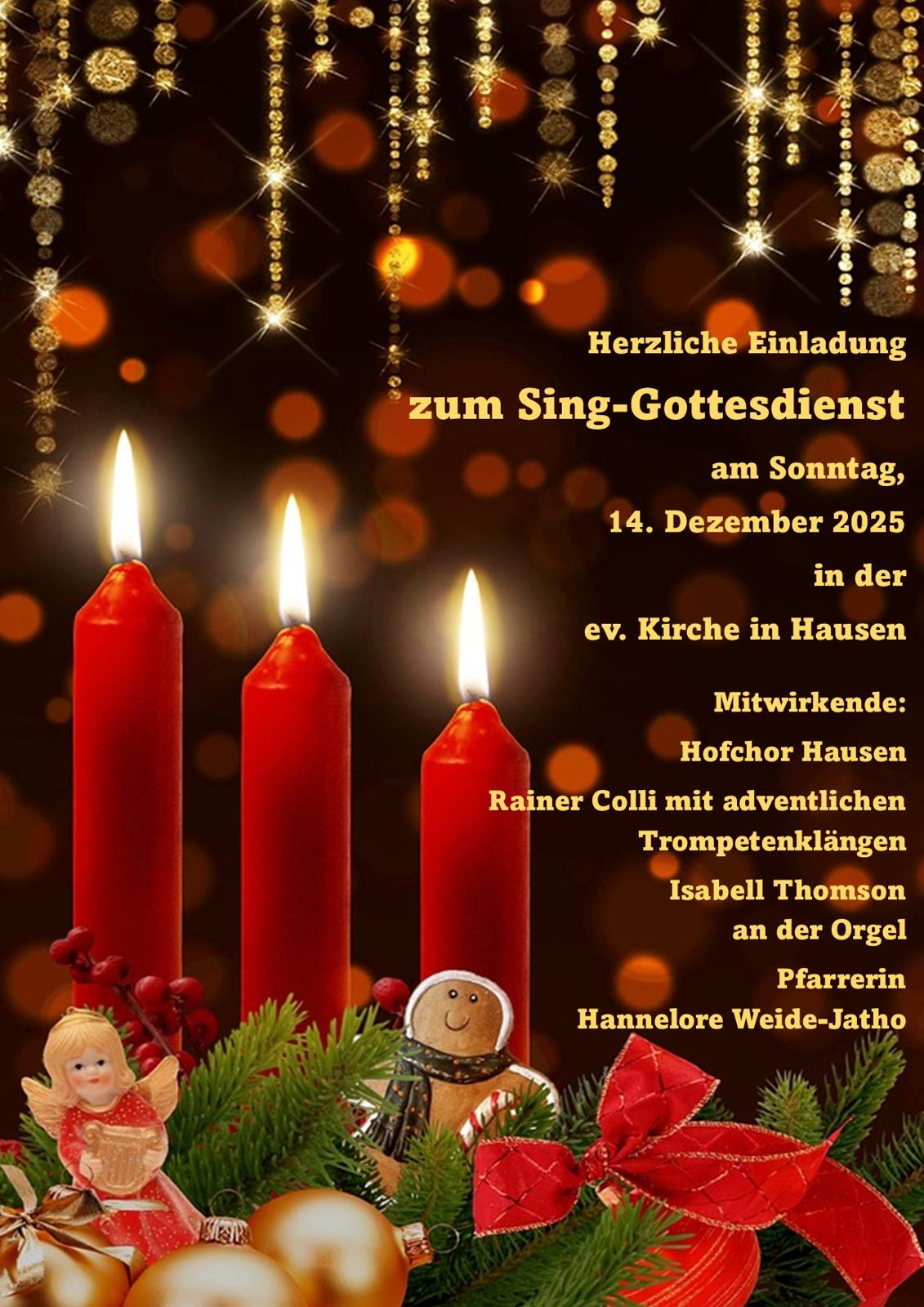 Sing-Gottesdienst am dritten Advent in Hausen 9 Dezember, 2025 by Karl-Heinz Klinger·Keine Kommentare Die Adventszeit nimmt weiter Fahrt auf in unseren Gemeinden. Herzliche Einladung zum Sing-Gottesdienst am 3. Advent in die wunderschöne Kirche in Hausen. Es wird ein stimmungsvoller und besinnlicher Abend. Beginn: 18:00 Uhr.