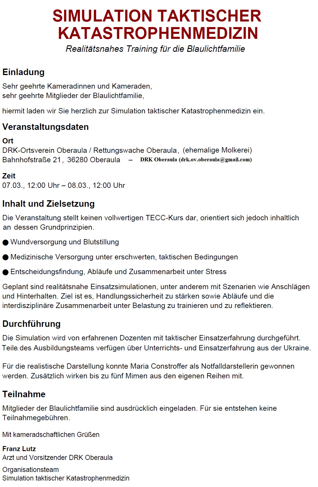 Einladung zur SIMULATION TAKTISCHER KATASTROPHENMEDIZIN 10 Februar, 2026 by Karl-Heinz Klinger·Keine Kommentare Einladung_Simulation_taktische_Katastrophenmedizin https://hausen-aulatal.de/wp-content/uploads/2026/02/VIDEO-Simulation_taktsche_Katastrophenmedizin.mp4