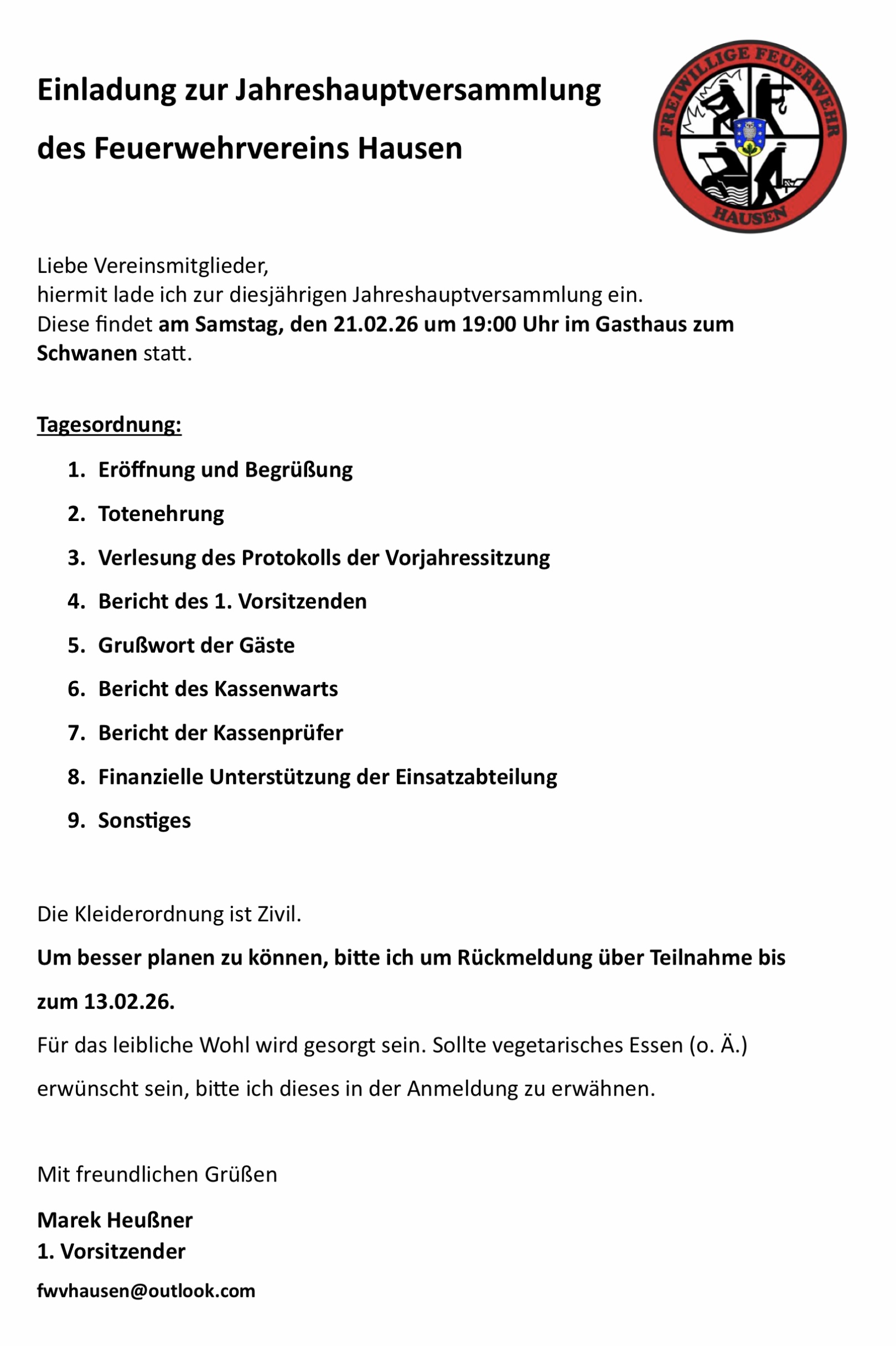 Morgenabend lädt der Vorsitzende des Feuerwehrvereins Hausen Marek Heußner zur JHV ein.