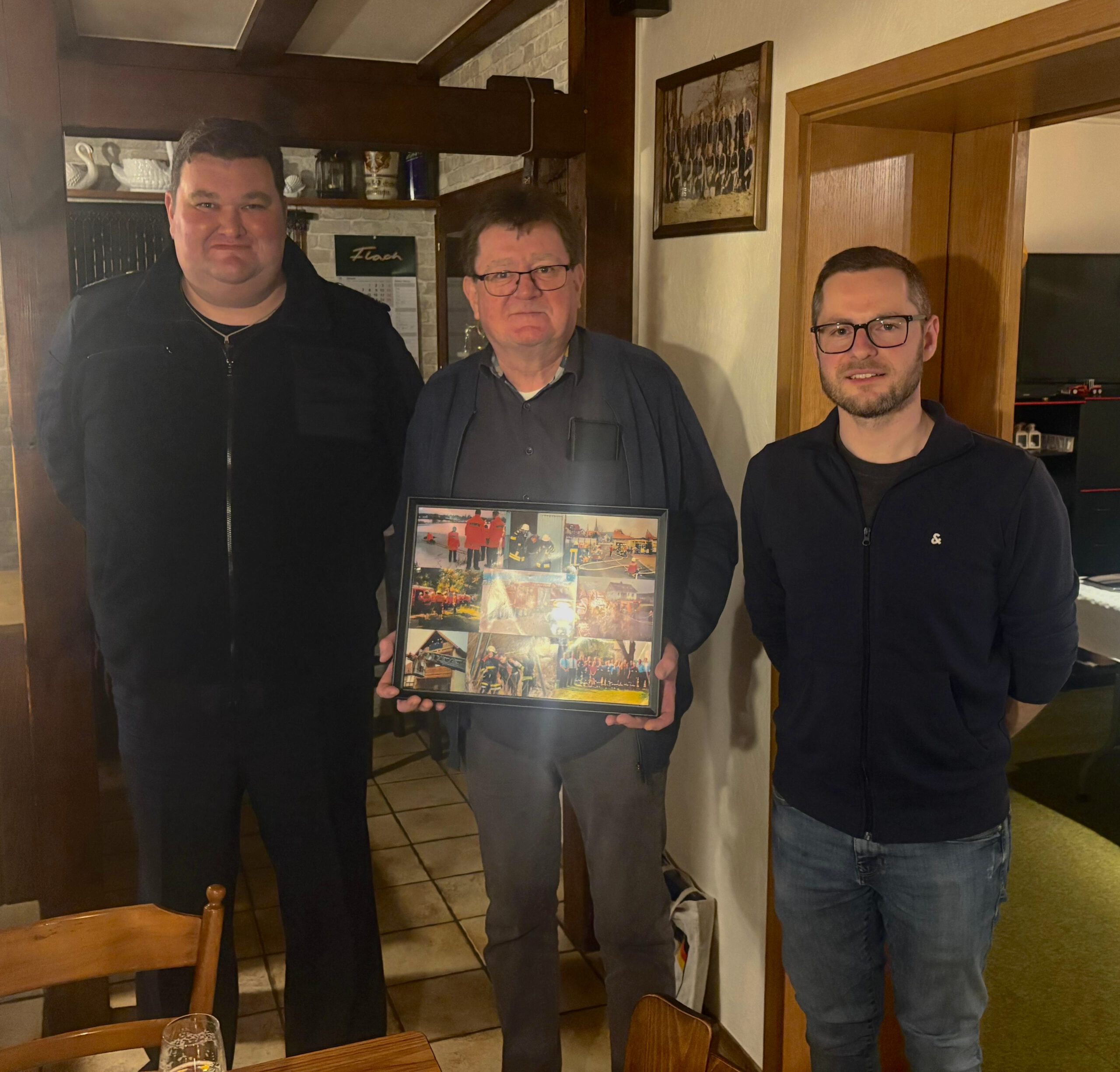Für seine langjährigen Verdienste um die Feuerwehr wurde Ullrich Riegelmann zum Ehrenmitglied ernannt. Als Dank und Erinnerung an seine aktive Zeit überreichten ihm Alexander Kurz (li.) und Marek Heußner (re.) eine Fotocollage.