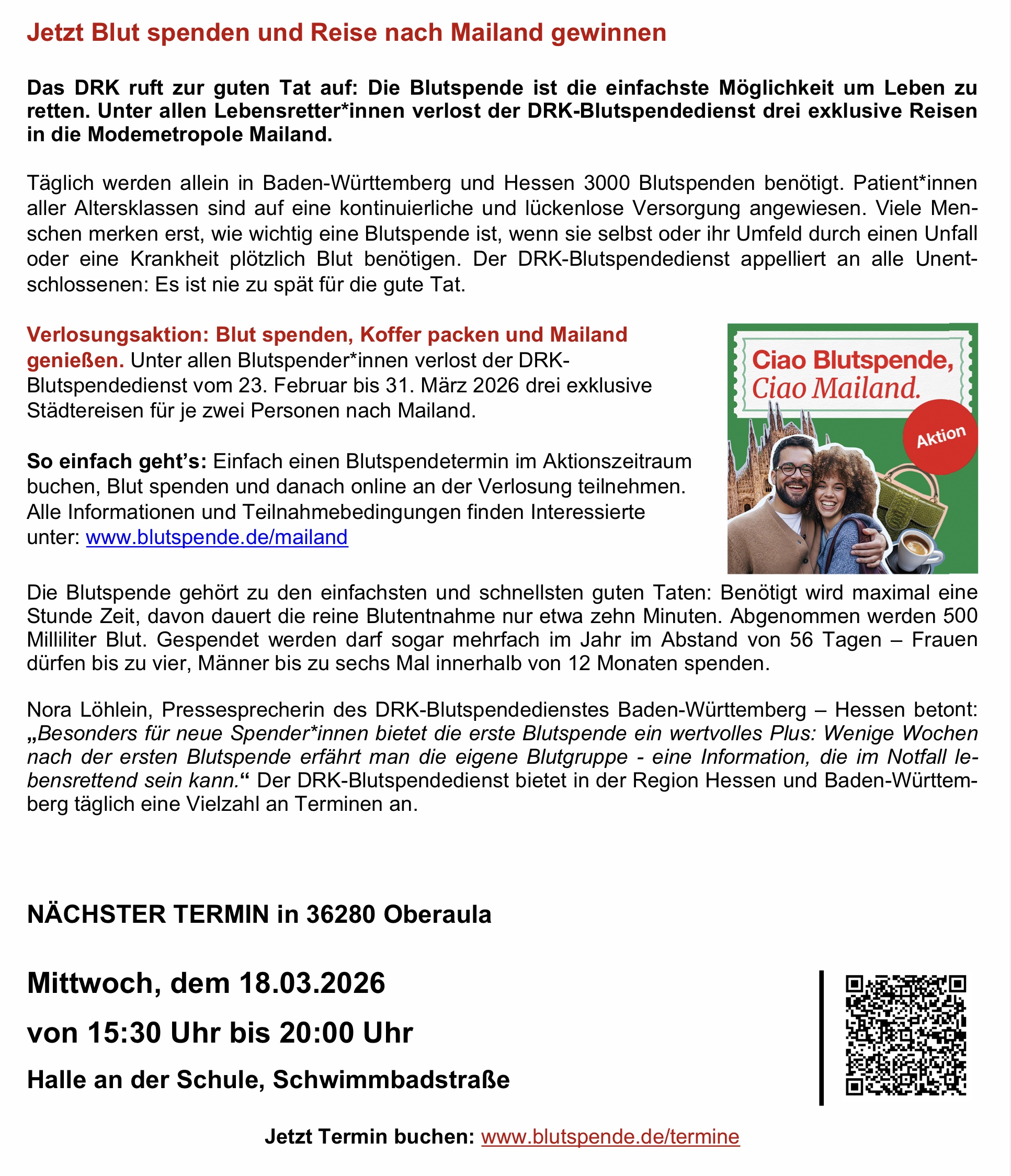 Alle Informationen und Teilnahmebedingungen finden Interessierte unter: www.blutspende.de/mailand