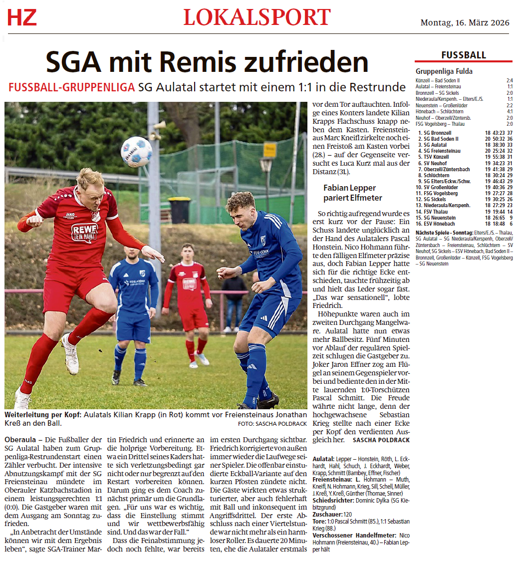 Oberaula – Die Fußballer der SG Aulatal haben zum Gruppenliga-Restrundenstart in der Fuldaer Staffel einen Zähler verbucht. Der intensive Abnutzungskampf mit der SG Freiensteinau mündete im Oberauler Katzbachstadion in einem leistungsgerechten 1:1 (0:0).